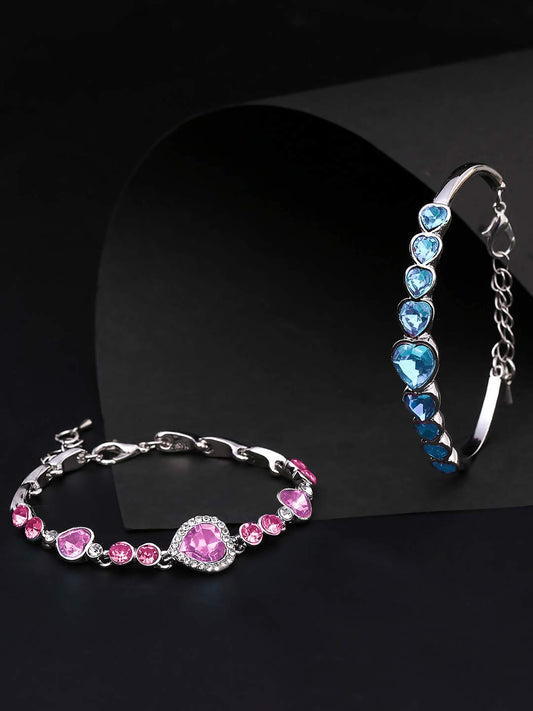 Combo Bracelets for Women 2 PCs Valentines Special Blue Pink Crystal Love Heart Charm Bracelet for Women and Girls.