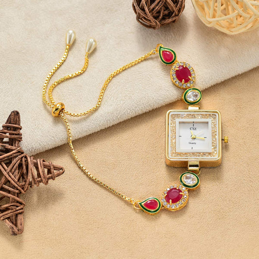 Classic Design Crystal Studded Kundan Gold Plated Traditional Square Shaped Adjuatable Chain Charm Bracelet for Women & Girls