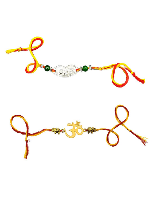 Set of 2 Pcs Handmade Dori Worked Silver and Gold Toned OM and Floral Design Rakhi for Brother with Roli & Chawal for Men