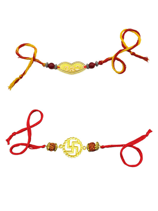 Set of 2 Pcs Handmade Dori Worked Gold Toned Swastik and BRO Engraved Design Rudraksh Rakhi for Brother with Roli & Chawal, Red, Gold, Medium (YCTJRK-12BHAY-GL) for Men