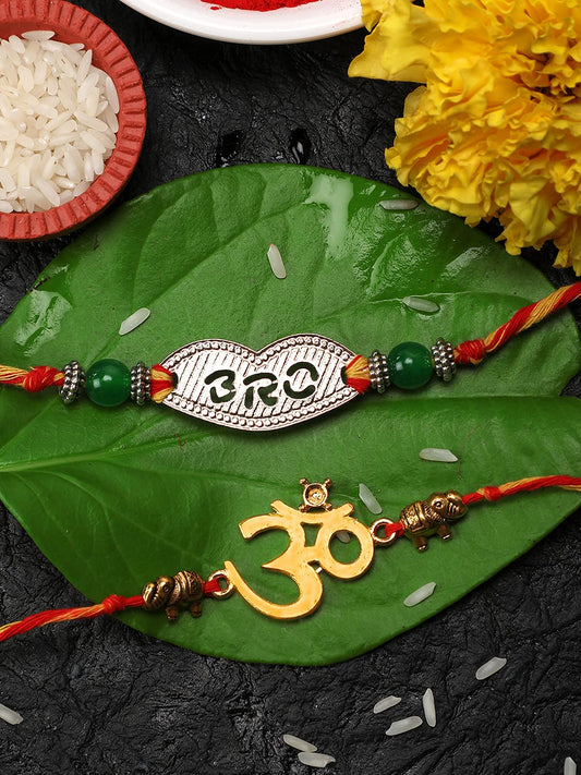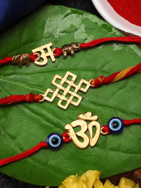 Combo of 3 Pcs Handmade Dori Worked Gold Toned OM Initial Letter A and Celtic Design Evil Eye Beads Rakhi for Brother with Roli & Chawal, Red, Gold, Medium (YCTJRK-33BHAY-GL)