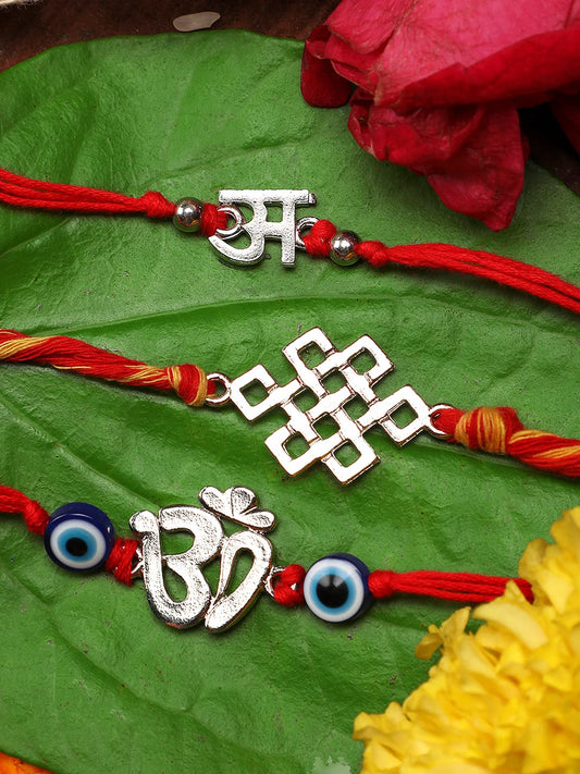 Combo of 3 Pcs Handmade Dori Worked Silver Toned OM Initial Letter A and Celtic Design Evil Eye Beads Rakhi for Brother with Roli & Chawal, Red, Silver, Medium (YCTJRK-32BHAY-SL)