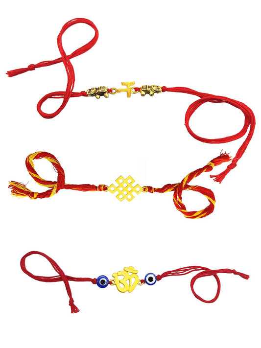 Combo of 3 Pcs Handmade Dori Worked Gold Toned OM Initial Letter N and Celtic Design Evil Eye Beads Rakhi for Brother with Roli & Chawal, Red, Gold, Medium (YCTJRK-27BHAY-GL)
