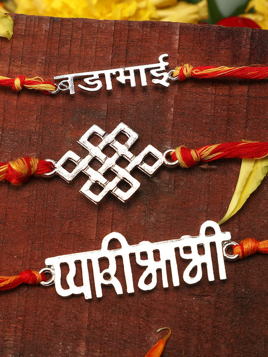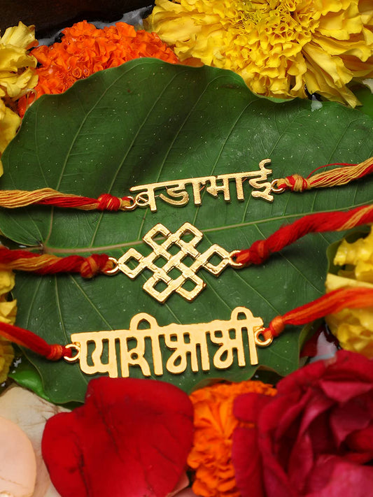 Combo of 3 Pcs Handmade Dori Worked Gold Toned Bada Bhai Pyari Bhabhi and Celtic Design Bhaiya Bhabhi Rakhi with Roli & Chawal, Red, Gold, M (YCTJRK-07BAIBHIB-C-GL)