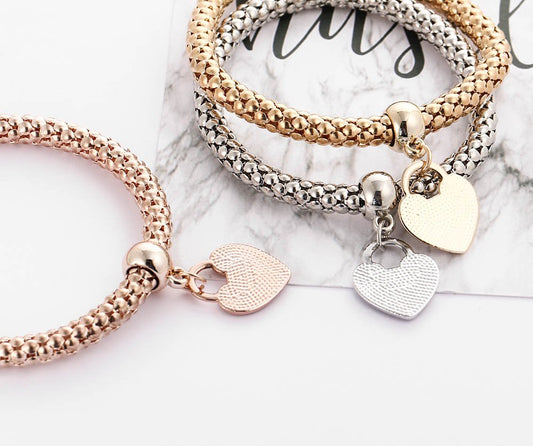 YELLOW CHIMES 3 Pcs Alloy and Australian Crystals Heart Charms Elastic Bangles and Bracelet for Women & Girls. Free Size.