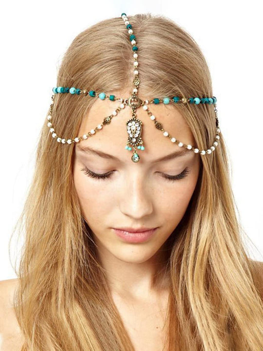 Head Chain For Women Bohemian Crystal Headband With Blue Wooden Beads Head Chain Tassel For Women and Girls