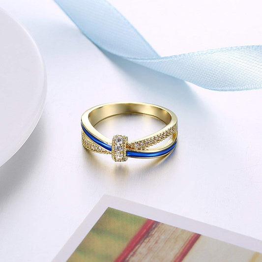 Rings for Women Romantic Love Knot Prong Setting 18K Gold Plated White Crystal and Blue Colore Ring for Women & Girls (Size US 6)