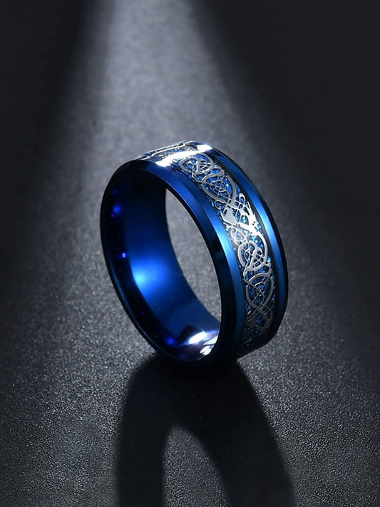 Rings for Men 2 Pcs Combo Silver and Blue Colored Dragon Celtic Inlay Polish Finish Titanium Steel Rings for Men & Boys