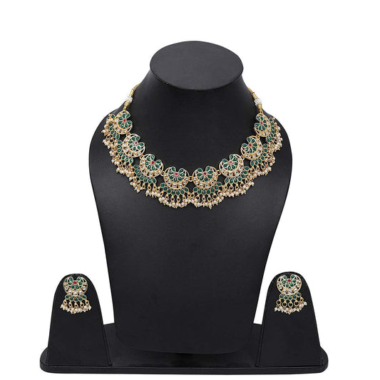 Ethnic Handcrafted Green Beads Floral Kundan Jewellery Set Gold Plated Traditional Choker Necklace Set for Women and Girls (Green, Gold)