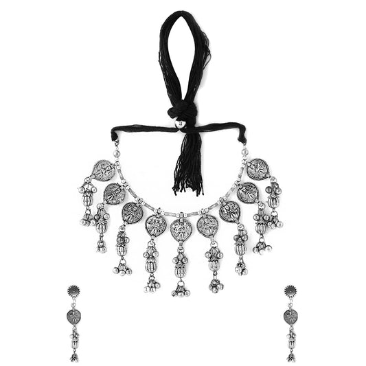 Jewellery Set For Women Silver Oxidised Floral and Leaf Shaped Fattering Adjustable Choker Necklace Set For Women and Girls