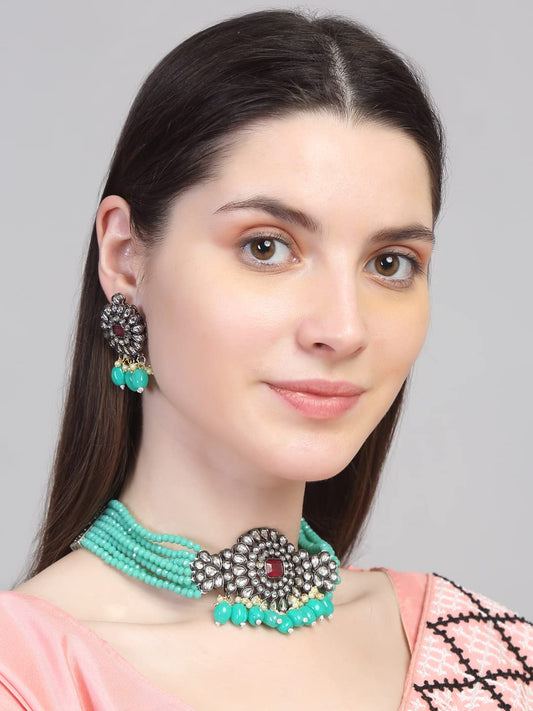 Kundan Jewellery Set for Women Green Beads Jewellery Set Ethnic Traditional Choker Necklace Set for Women and Girls
