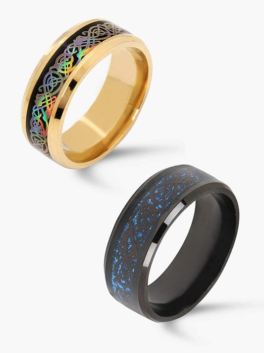 2 Pcs Combo Dragon Celtic Inlay Polish Finish Titanium Steel Gold/Blue Rings for Men & Boys