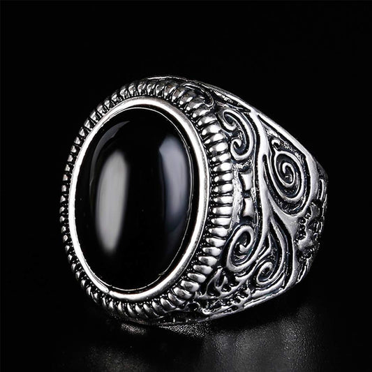 Antique Oval Cabochon Natural Black Stone Evil Protection Statement Ring for Men and Boys