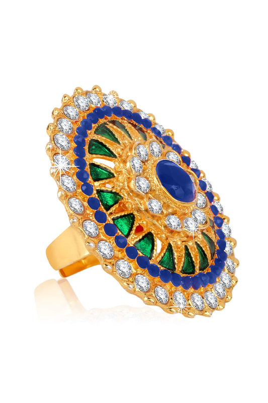 Traditional Ethnic Stones Studded Gold Plated Cocktail Wedding Rings for Women & Girls (Blue)