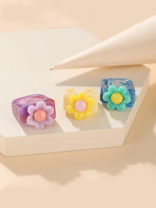 Rings for Women and Girls Acrylic Daisy Rings | Multicolor 3 Pcs Floral Ring Set Knuckle Finger Stackable Band Ring | Birthday Gift For Girls and Women