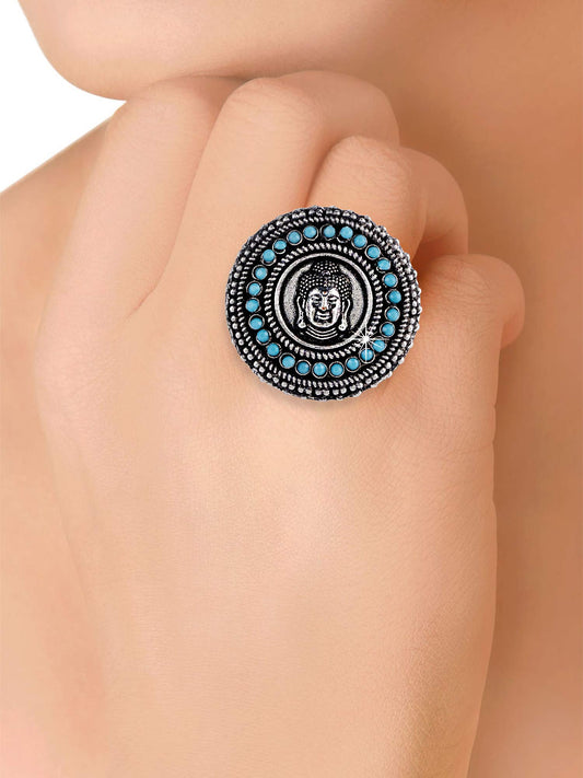 Buddha Artistic Crafted Silver Oxidized Traditional Rings for Women and Girls (Blue)