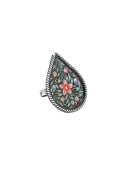 Oxidised Rings for Women Green Meenakari Hand Painted Silver Oxidised Ring Adjustable Finger Rings for Women and Girls.