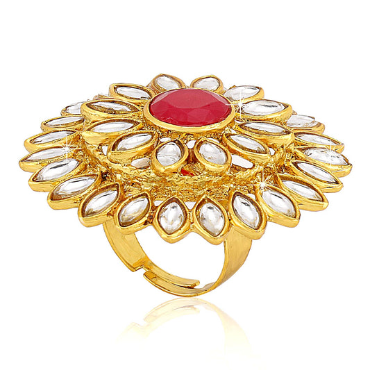 Women's Traditional Red Cocktail Adjustable Stone Gold Plated Kundan Studded Cocktail Finger Ring