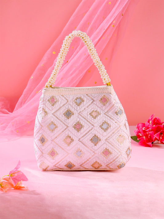 Potli Bags - Ethnic Pearl Beaded Wristlet | 18x8x18 cm | White