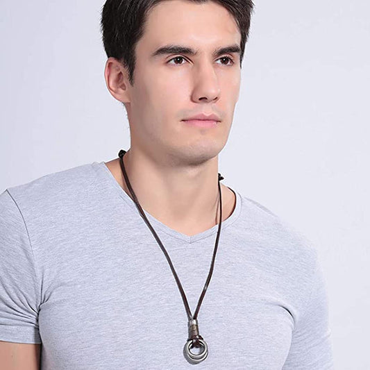 Stainless Steel Silver Circle Locket with Brown Leather Rope Pendant for Men and Boys
