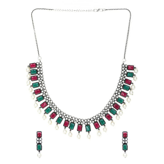 Jewellery Set for Women and Girls Traditional Silver Oxidised Jewellery Set Multicolor Choker Set | Studded Stone Choker Necklace Set for Women | Birthday Gift For Girls and Women Anniversary Gift for Wife