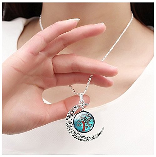Crescent Moon Life Tree Glass Cabochon Pendant with Chain Necklace for Women and Girls (Blue)