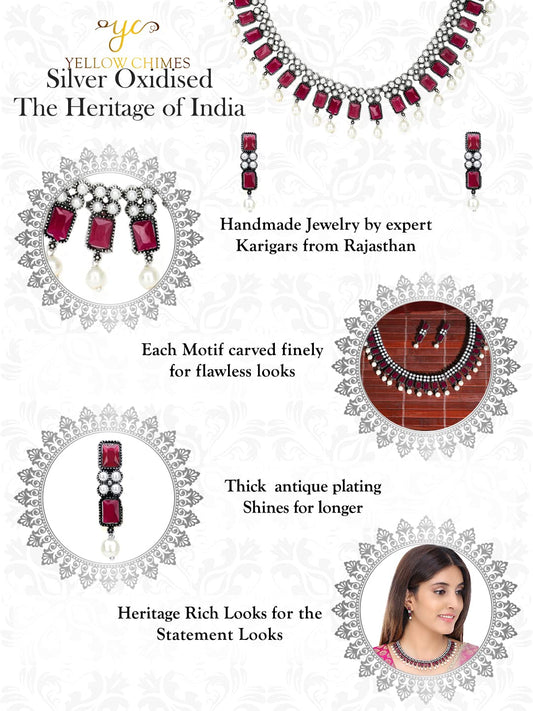 Jewellery Set for Women and Girls Traditional Silver Oxidised Jewellery Set Pink Choker Set | Studded Stone Choker Necklace Set for Women | Birthday Gift For Girls and Women Anniversary Gift for Wife