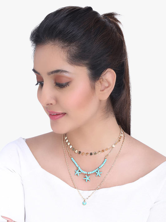 Necklace For Women Multilayered Gold Toned Blue Color Beads Studded Star Charm Hanging Bohemian Neckchain For Girls and Women