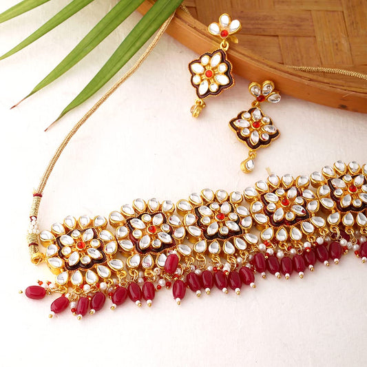 Ethnic Handcrafted Classic Jewellery Set Studded Stoned Gold Plated Traditional Choker Necklace Set for Women & Girls