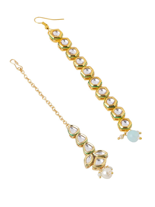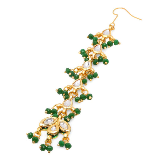 Maangtikka for Women Gold Toned Kundan Studded Single Line Designed Green Pearl Drop Maangtikka for Women and Girls