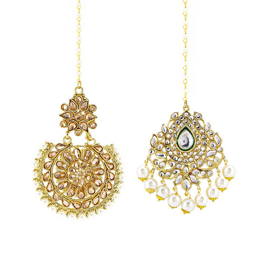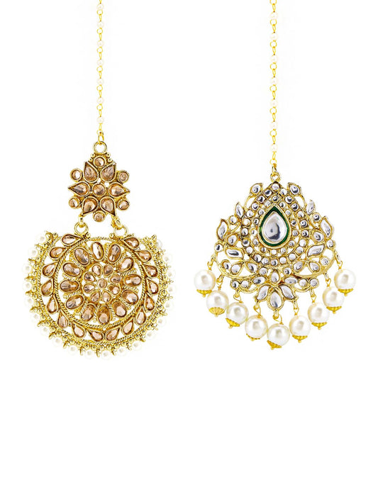 Maangtikka for Women Gold Toned 2 Pcs of Kundan Studded Single Line Designed Pearl Drop Maangtikka for Women and Girls