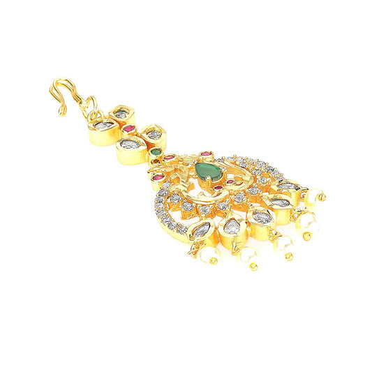 Classic AD/American Diamond Studded Gold Plated Multicolour Stone Maang Tikka for Women and Girls, Multicolor, Medium