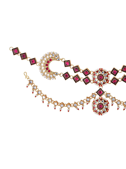 Maantikka Daamini for Women Gold Toned Kundan and Red Crystal Studded Daamini Maang Tikka for Women and Girls