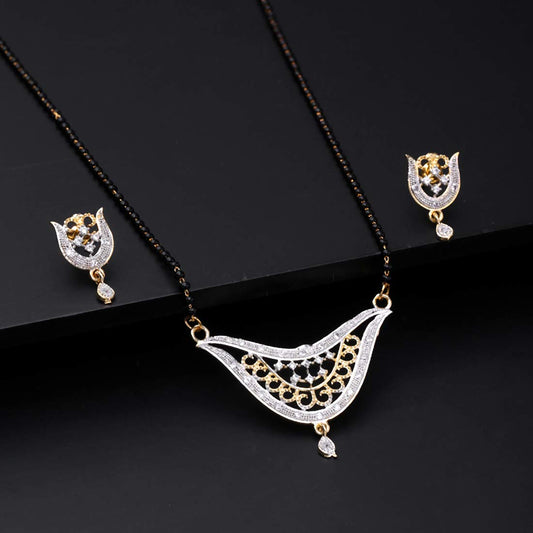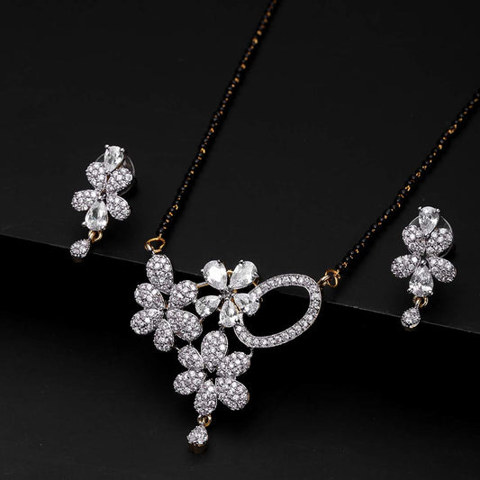 Sparkling AD/American Diamond Studded Ethnic Traditional Black Beads Designer Floral Shaped Mangalsutra Pendant Set with Earrings for Women