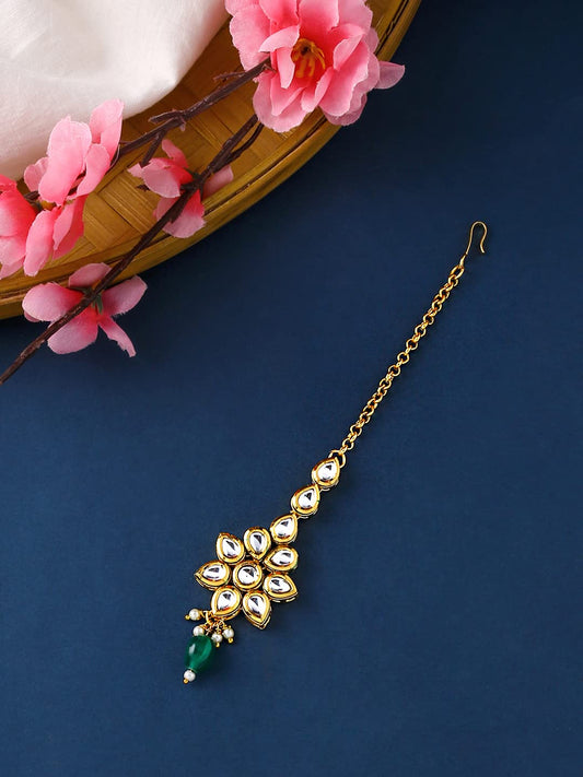 Maang Tikka for Women Gold Toned Kundan Studded Green Pearl Drop Floral Designed Maang Tikka for Women and Girls