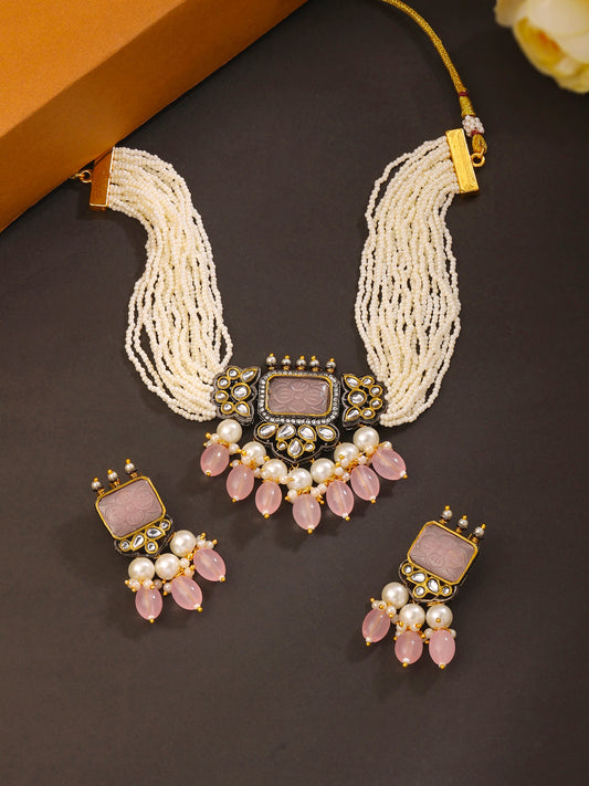 Traditional Pearl Jewellery Set: Semi-precious Stone Choker | Adjustable | White/Pink