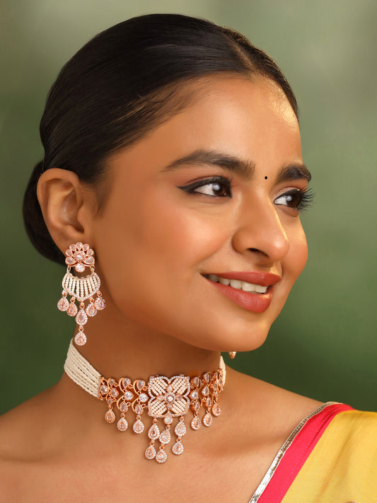 Stunning White Stone Necklace Set: Choker with Earrings | One Size | Rose Gold Plated | Elegant Design