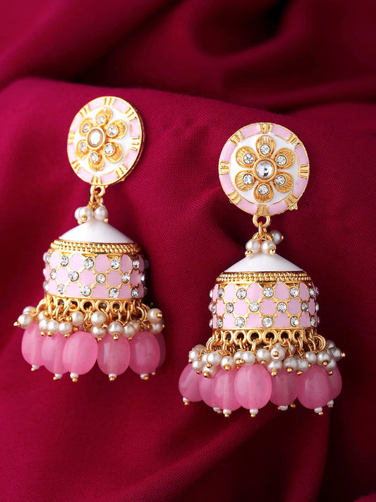 Elegant Pink AD/American Diamond Studded 18k Gold Plated HandCrafted Designer Jhumka/Jhumki Earrings for Women & Girls