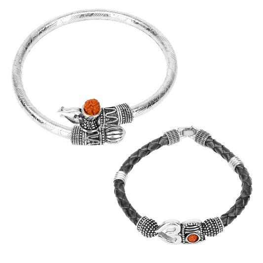 Combo of Two Oxidized Silver Shiva Trishul Rudraksha Damroo Kada Bracelet Bangle for Men and Boys
