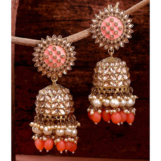 Ethnic Gold Plated Traditional Kundan Studded Peach Meenakari Touch Pearl moti Jhumka Earrings for Women and Girls, Gold, Peach, Medium (Model: YCTJER-88JHKLG-PCH)