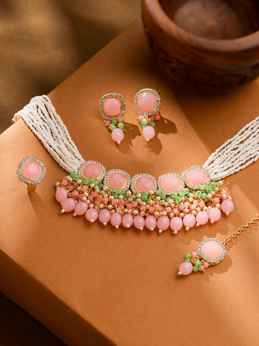 Traditional Pink Stone Studded Choker Necklace Set | Pearl Jewelry | Gift for Women
