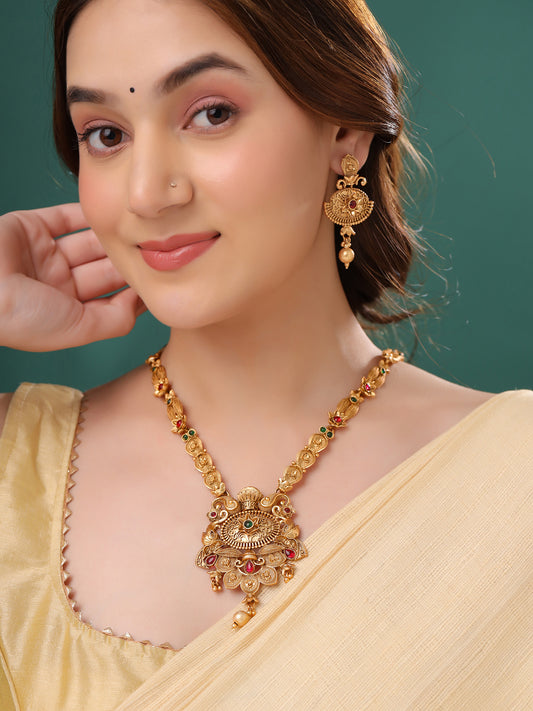 Gold Plated Temple Jewellery Set for Women - Elegant Design | Necklace & Earrings | 21.2 cm | Gold