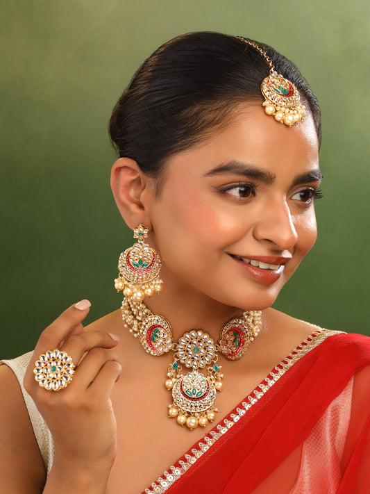Wedding Jewellery Set: Gold Plated Kundan Choker with Green Beads | Perfect for Anniversaries | Gold/Green