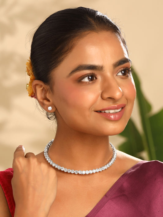 Elegant Silver AD Necklace Set: American Diamond Jewelry with Lightweight Design | Lobster Clasp | 32cm