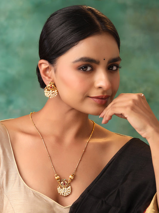 Traditional South Indian Jewellery Set: Gold Plated Pearl Necklace with Earrings | One Size | Gold