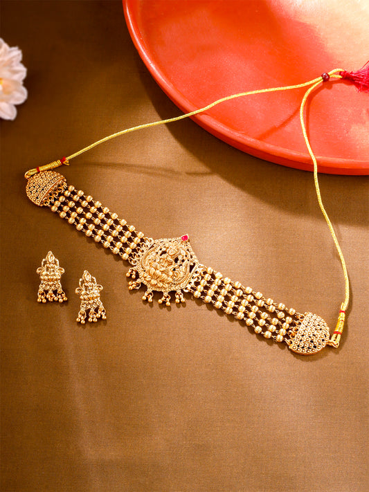 Jewellery Set: Gold Plated Choker Necklace with Lakshmi Motifs | Earrings Included | Adjustable | Gold
