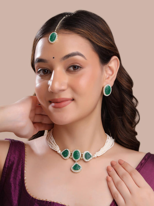 Jewellery Set for Women and Girls Traditional Kundan Dulhan Bridal Jewellery Set Green Beads Layered Choker Necklace Set for Wedding Gold Plated Bridal Set for Women