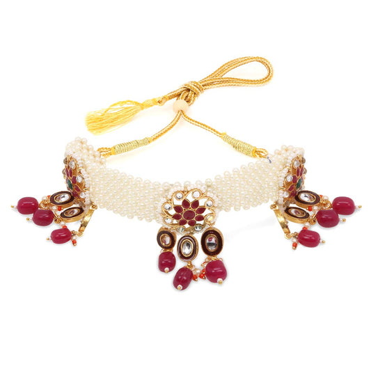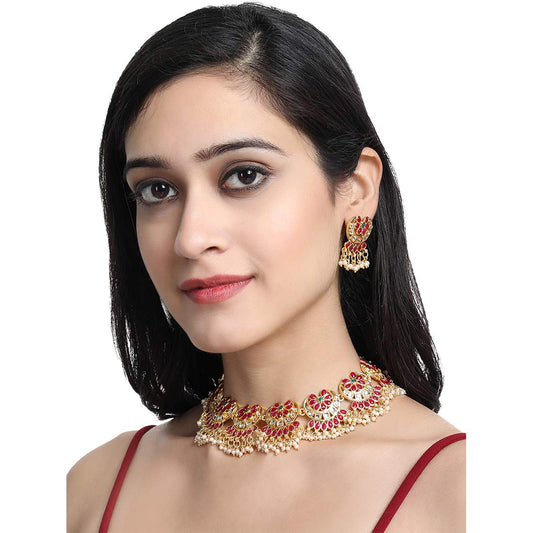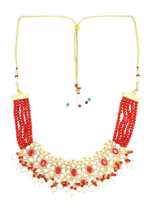Ethnic Handcrafted Red Beads Floral Kundan Jewellery Set Gold Plated Traditional Choker Necklace Set for Women and Girls