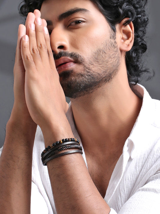 Brown Leather Bracelet for Men - Stylish Beaded Hand Accessory | One Size | Perfect Gift