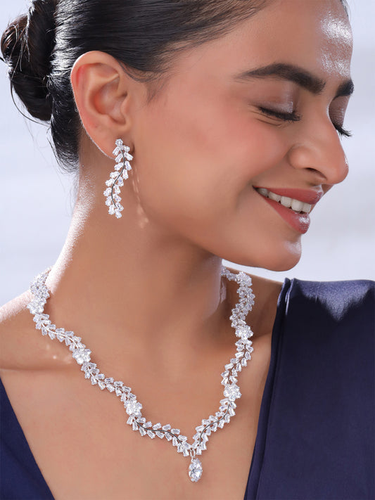 Jewellery Set for Women | White Stone Necklace Set for Women | Cubic Zircon Silver Diamond Jewellery Set |Rhodium Plated Necklace Set | Birthday Anniversary Gift for Women Wife